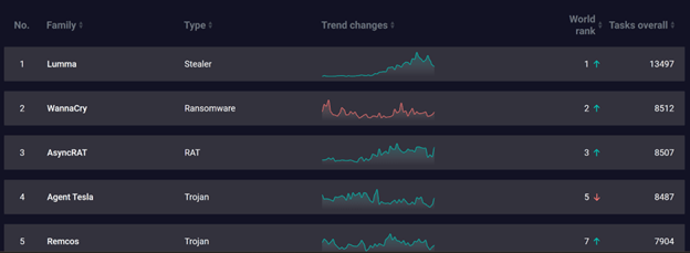 We saw a lot of Infostealer activities last year. In 2024, the Anyrun Malware Trends tracker reported that the Lumma Infostealer remained at the top of the charts for several months and had 13,497 activities reported worldwide.