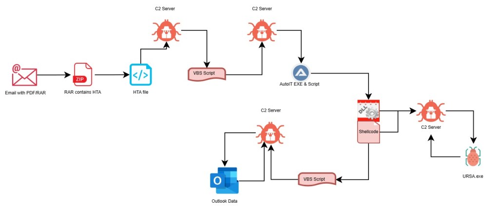 Attack Chain: RAR-> HTA file-> VBScript-> Auto IT script+ Auto IT EXE-> DLL+shellcode-> attrib.exe/regsvcs.exe-> VBScript+Exe-> Scheduled Task