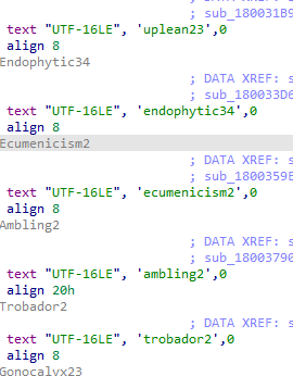 - Sequence tracking: Unique variable names (semierectness24, urlar234, carbonator, peasouper4, ballastic4, acidophilous3 etc) are used to maintain execution order and verify correct shellcode reassembly.