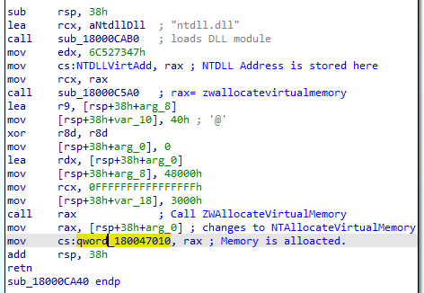 A critical function loads ntdll.dll and resolves NtAllocateVirtualMemory to allocate a memory buffer for the next-stage payload.