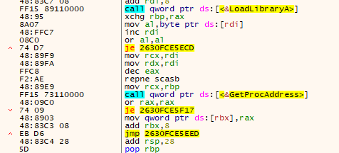 Once the shellcode is fully staged in memory, the loader resolves essential Windows API functions—including LoadLibraryA, GetProcAddress, VirtualProtect, and InternetOpen—via dynamic resolution.