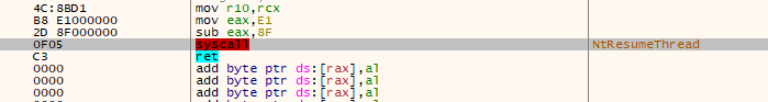 - NtResumeThread → resume the suspended main thread, triggering APC execution
