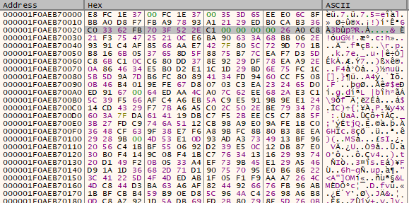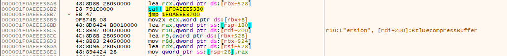 - The payload is decompressed using RtlDecompressBuffer into a newly allocated memory page. The decompressed data contains a full PE file structure but the PE headers does not contain a valid section table.