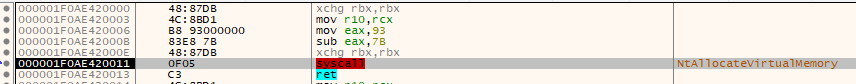 - NtAllocateVirtualMemory – Allocates a new memory region in the current process with RWX permissions.