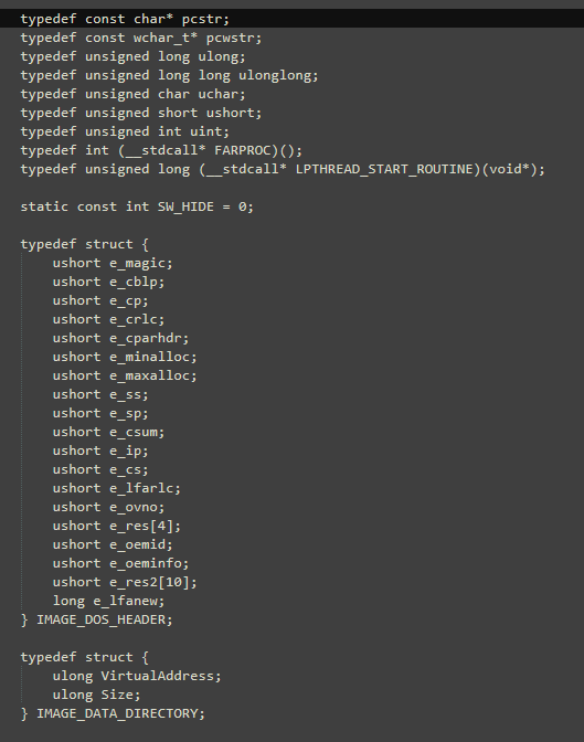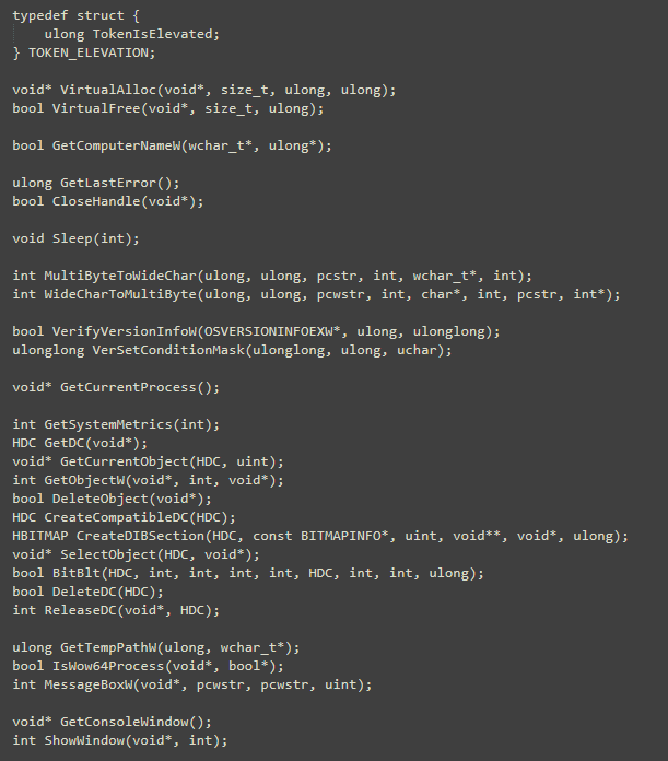 – IMAGE_DOS_HEADER, IMAGE_DATA_DIRECTORY, IMAGE_FILE_HEADER, IMAGE_OPTIONAL_HEADER32, IMAGE_NT_HEADERS32, IMAGE_OPTIONAL_HEADER64, IMAGE_NT_HEADERS64, IMAGE_EXPORT_DIRECTORY, LIST_ENTRY, PEB_LDR_DATA, PEB, UNICODE_STRING, LDR_DATA_TABLE_ENTRY, BITMAPINFOHEADER, BITMAPFILEHEADER, BITMAP, RGBQUAD, BITMAPINFO, OSVERSIONINFOEXW, TOKEN_ELEVATION