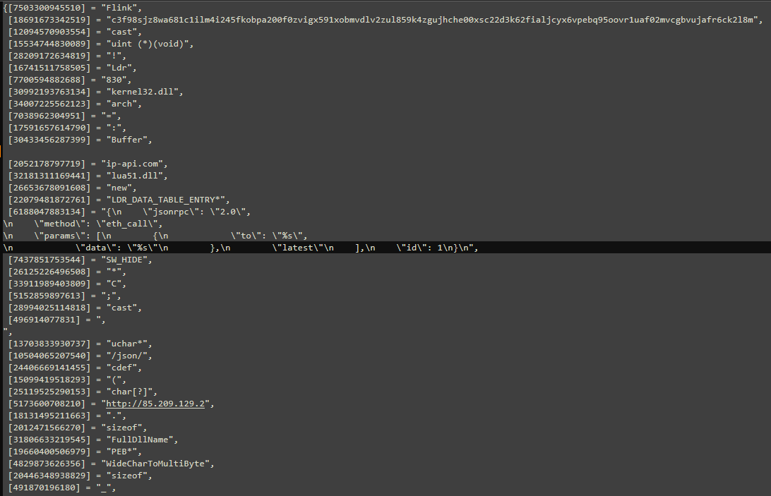The second analyzed Lua script variant also begins with sequences of decimal-encoded payload . However, after deobfuscation, these decimal bytes are interpreted and decoded differently. The decimal values are converted into byte sequences that represent string characters using the Windows-1252 (CP1252) character encoding set. After correcting the encoding and patching remaining tamper/anti-debug checks, the following key IOCs were recovered from the second script variant: