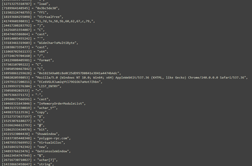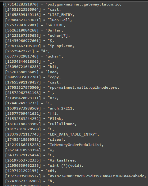 The script establishes a connection to the attacker’s C2 domain. All key Indicators of Compromise (IOCs), including C2 URLs, XOR keys, download paths, and Polygon RPC addresses are stored in obfuscated Lua tables within the script.