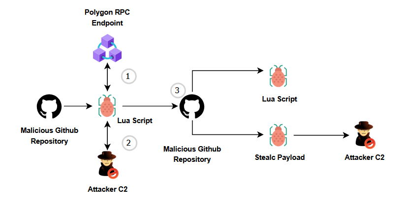 1. The Lua script executes and connects to a Polygon RPC endpoint (leveraging the blockchain network for C2 retrieval).