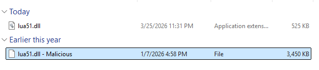 In the analyzed malicious package, the file lua51.dll is a trojanized version of the legitimate Lua 5.1 runtime library, commonly used with LuaJIT for script execution. The file size of the malicious lua51.dll is noticeably larger than legitimate versions. The malicious DLL exports additional functions, particularly those tied to LuaJIT’s FFI (Foreign Function Interface) module to invoke the core Lua C API functions.