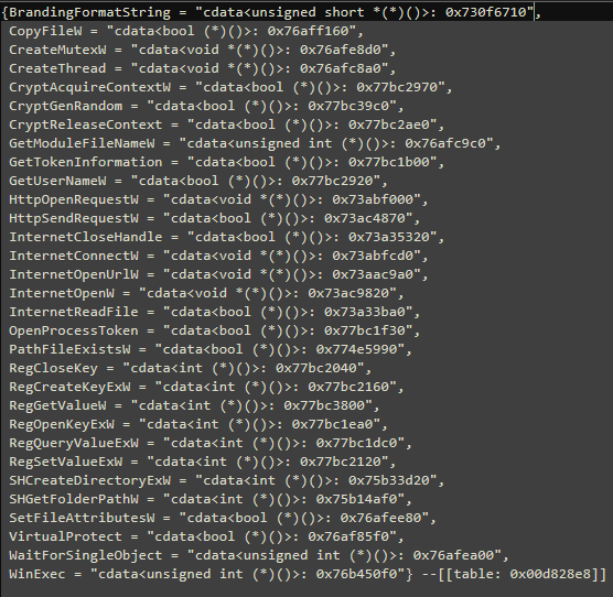 The script finally extracts the base64 payload to a table. The script also populates an additional table with the strings required to execute the C code.