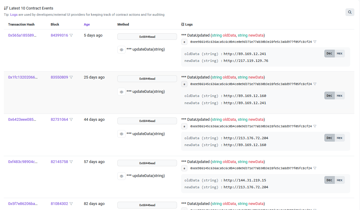 The threat actors are actively leveraging the Polygon Proof-of-Stake (PoS) blockchain to store and manage their command-and-control (C2) server information. By examining the relevant smart contract on a Polygon blockchain explorer (such as PolygonScan), we observe that the attackers frequently create new transactions to update the stored C2 data.
